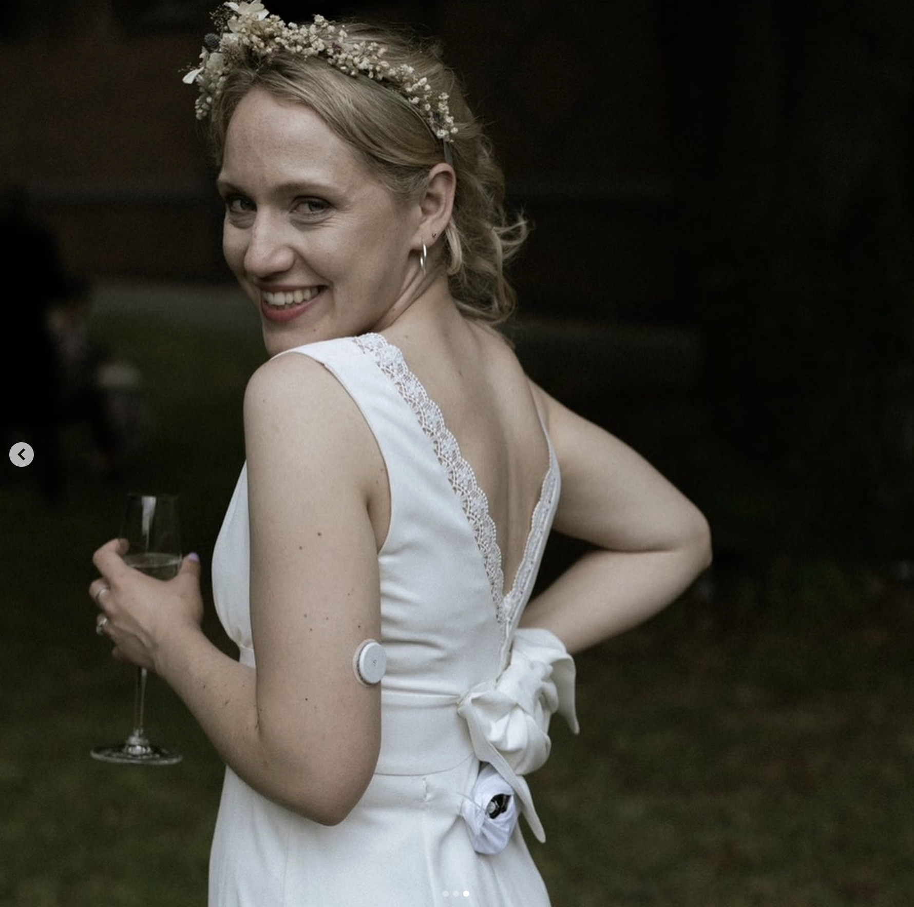 “I just wanted to share some photos of how your Hid-In pouch enabled me to wear my pump so easily and comfortably on my wedding day 😊. It felt a bit daunting balancing dress and pump! The seamstress sewed it [a Hid-in pouch] underneath the bow on the back of my dress - you’d never know!